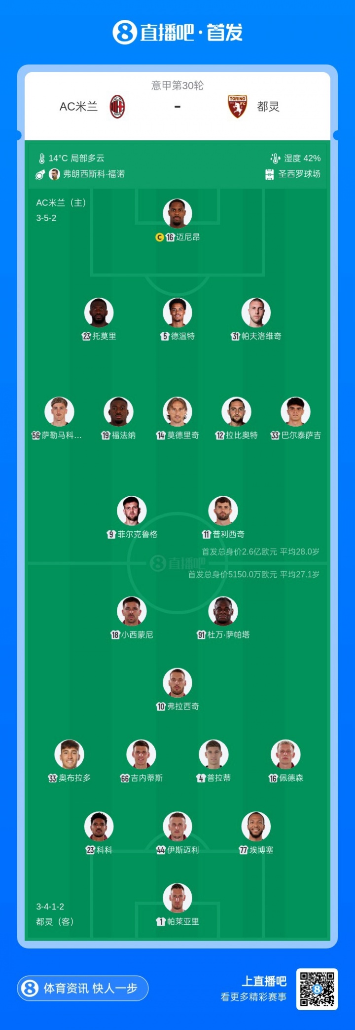 米兰首发阵容:16-迈尼昂、23-托莫里、5-德温特、31-帕夫洛维奇、56-萨勒马科尔斯、14-莫德里奇、19-福法纳、12-拉比奥特、33-巴尔泰萨吉、11-普利西奇、9-菲尔克鲁格