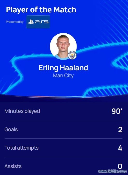 10月2日讯 在曼城客场2-2战平摩纳哥后,梅开二度的哈兰德当选全场最好。