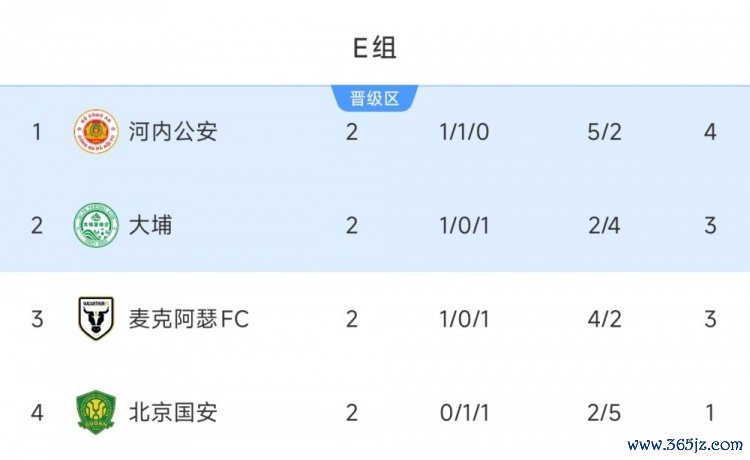 积分榜方面,河内公安1胜1平积4分居首,大埔、麦克阿瑟FC同积3分位居二三位,北京国安1平1负积1分垫底。