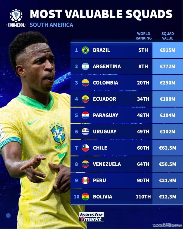 10月12日讯 德国转会商场网公布南好意思足联国度队身价排行,巴西队以9.15亿欧元总身价稳居榜首,天下杯冠军阿根廷队以7.72亿欧元位列第二。