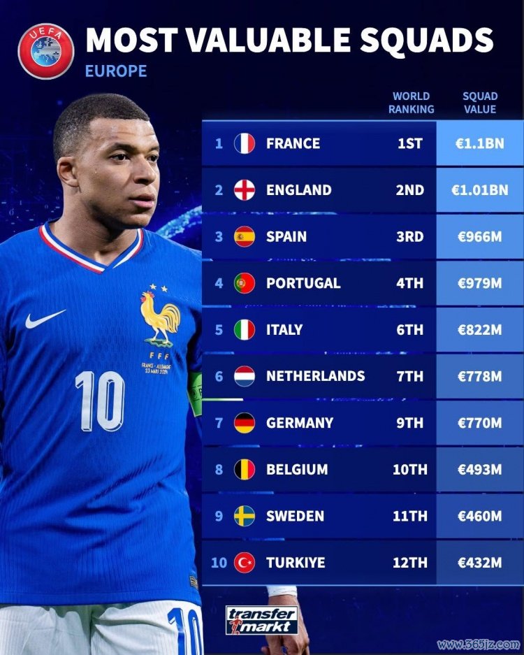 10月12日讯 德国转会商场网近日更新欧洲国度队身价排行,法国队以11亿欧元总身价高居榜首,英格兰(10.1亿欧)与葡萄牙(9.79亿欧)分列二、三位↓(转会商场图片中将西班牙与葡萄牙标反,应为葡萄牙第三、西班牙第四)