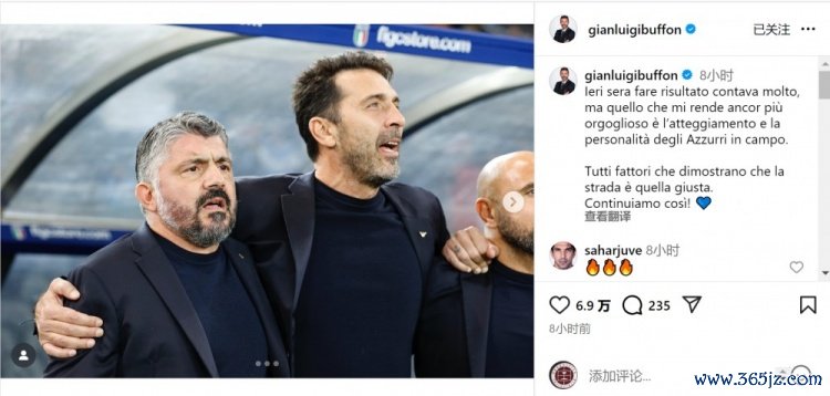 意大利国度队领队布冯社媒晒出与主帅加图索的合照,并写说念:“昨晚比赛的效果很是紧要,但更令我自傲的是蓝衣军团在赛场上展现的气魄和个性。”