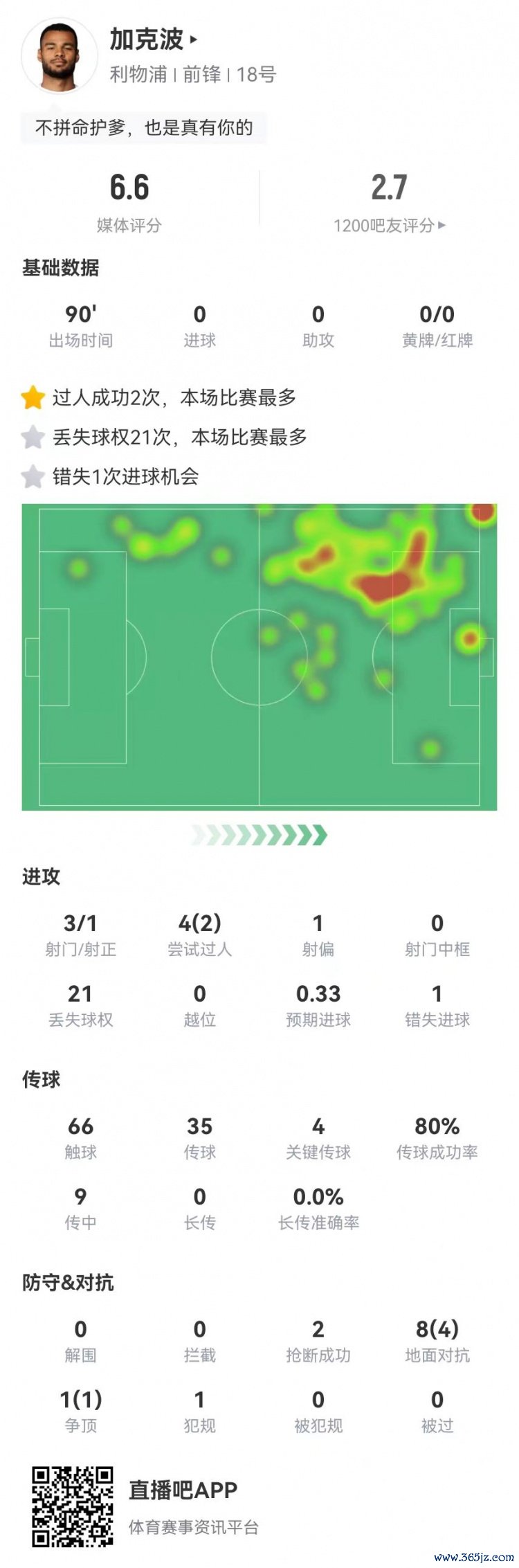 11月27日讯 利物浦在本轮欧冠1-4惨败埃因霍温,加克波本场数据如下: