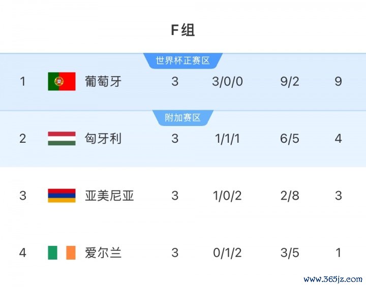 赛后,积分榜情况,葡萄牙3连胜积9分,排行第一;匈牙利4分第二、亚好意思尼亚3分第三、爱尔兰只消1分排行垫底。