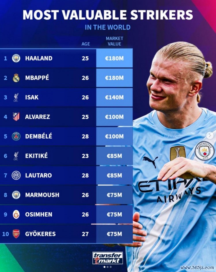 11月3日讯 德转列现时寰球足坛中锋身价名次,哈兰德、姆巴佩1.8亿欧比肩最高,伊萨克1.4亿欧,阿尔瓦雷斯、登贝莱1亿欧。
