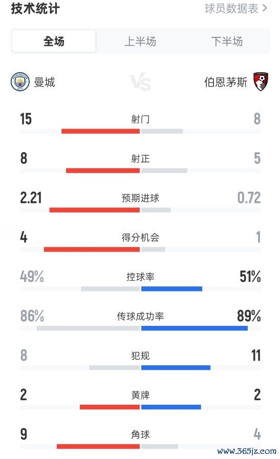 11月3日讯 2025-26赛季英超第10轮,曼城主场3-1伯恩茅斯。