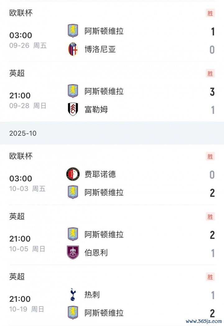 10月19日讯 今晚英超维拉2-1逆转热刺,赢得各赛事五连胜。