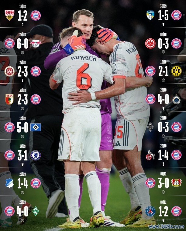 11月5日讯 本轮欧冠,拜仁2-1征服巴黎豪取16连胜,拜仁官方发布16连胜海报。拜仁的16连胜也连续刷新五大联赛最好开局记录,他们本月还将对阵柏林聚拢、弗赖堡、阿森纳以及圣保利。