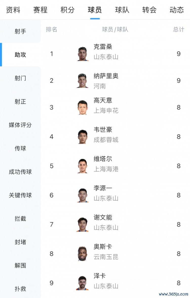 11月22日讯 2025年赛季中超联赛落下帷幕,在助攻榜方面,克雷桑和纳萨里奥9次并排第一。