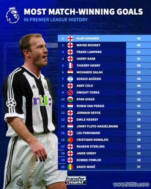 10月17日讯 德国转会阛阓清点了英超历史打进制胜球排名情况,希勒以68球居首,鲁尼66球位居次席。