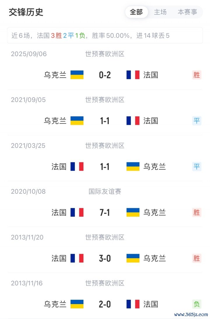 法国世初赛3胜1平积10分暂位D组第一;乌克兰2胜1平1负积7分暂位第二,近3轮不败。本场若法国慑服乌克兰,就将提前一轮晋级宇宙杯。法国正赛对阵乌克兰已流畅4场不败(2胜2平)。