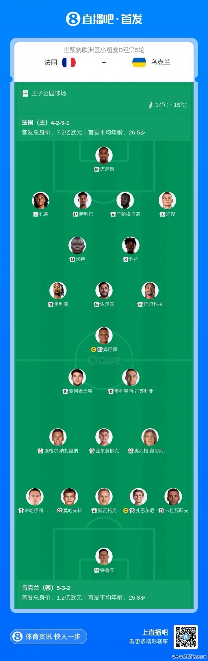 11月14日讯 世初赛欧洲区小组赛D组第5轮,法国主场迎战乌克兰,赛前两边首发公布。