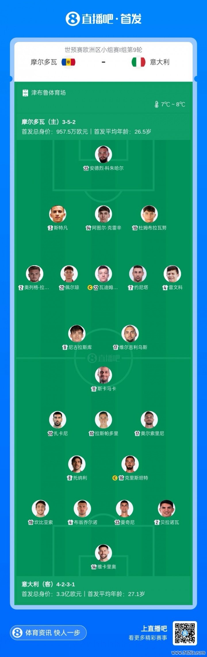 11月14日讯 世初赛欧洲区小组赛I组第9轮,摩尔多瓦主场迎战意大利,赛前首发名单公布。