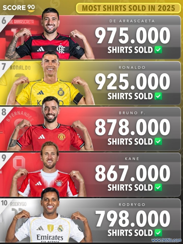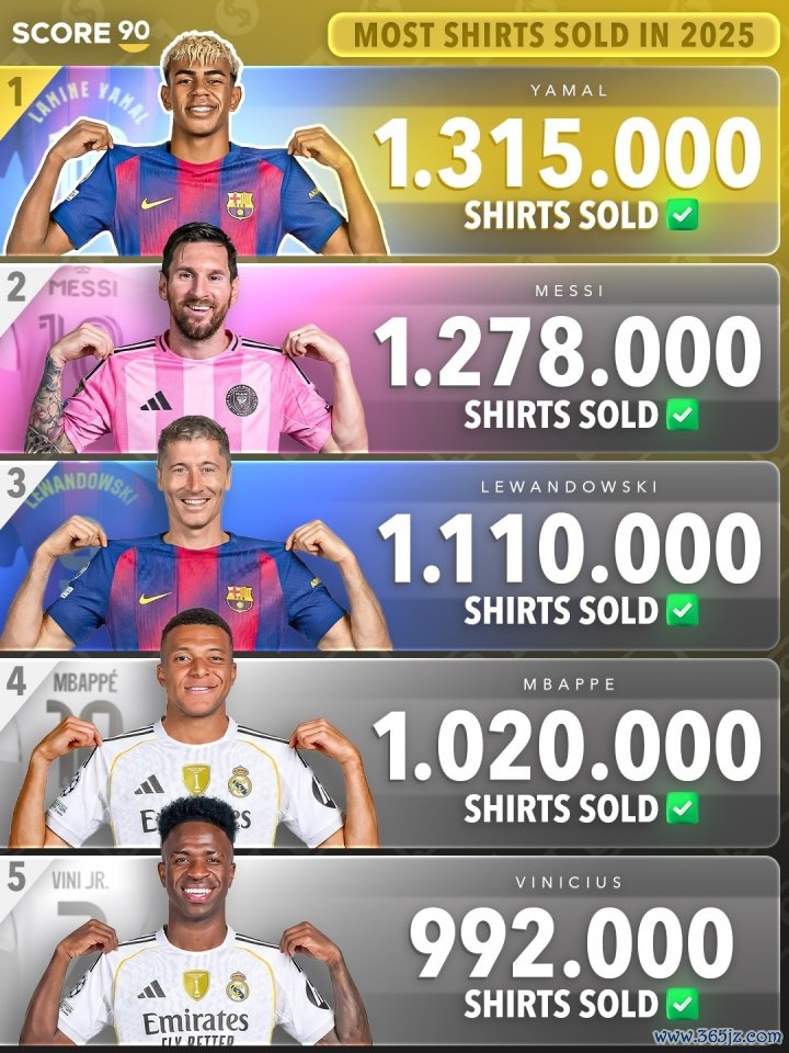 11月28日讯 Score 90征引Euromericas Sport Marketing数据,统计了2025年章程当今宇宙足坛的球员球衣销量榜,亚马尔以131.5万件排名第一,梅西第二,C罗位列第七。