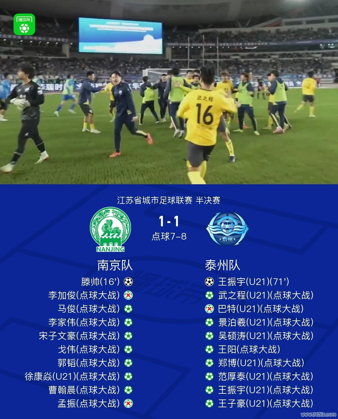 北京时辰10月18日江苏省城市足球联赛 半决赛,南京队主场对阵泰州队。上半场冯伯元头球摆渡,滕帅破门。下半场泰州队角球契机,王振宇将球蹭进球门。点球大战孟振踢飞存一火点球,泰州队8-7礼服南京队,总比分9-8晋级决赛。