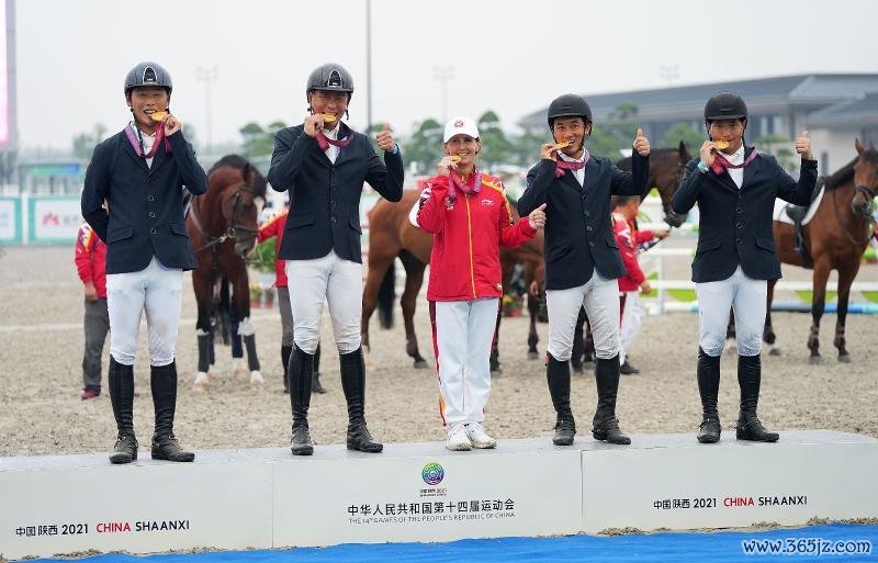 2021年9月23日,冠军上海队选手沈千里达、张滨、教授塔伦,选手杨华、许新(从左至右)在授奖庆典上庆祝。十五运,宿将张滨是第九次诱骗全运会。 新华社 发