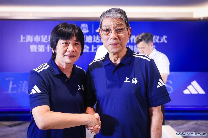 上海全运女足主教授水庆霞、上海全运男足U20队总教授徐根宝合手手。