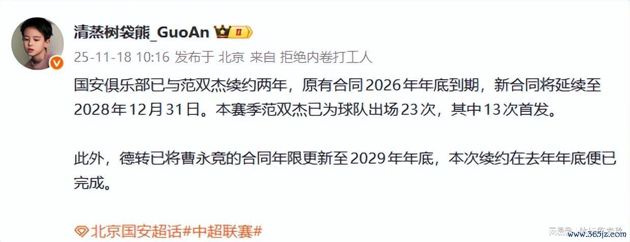 据某资深北京体育博主败露,国安刚刚与20岁的小将范双杰续签了一份新约,将原来2026年底到期的公约又继续了2年。另外,知名足球转会数据网站——德转网也更新了国安球员的公约数据,曹永竞与俱乐部的公约到期年限酿成了2029年底。届时,曹永竞依然32岁,很有可能会终老于国安。